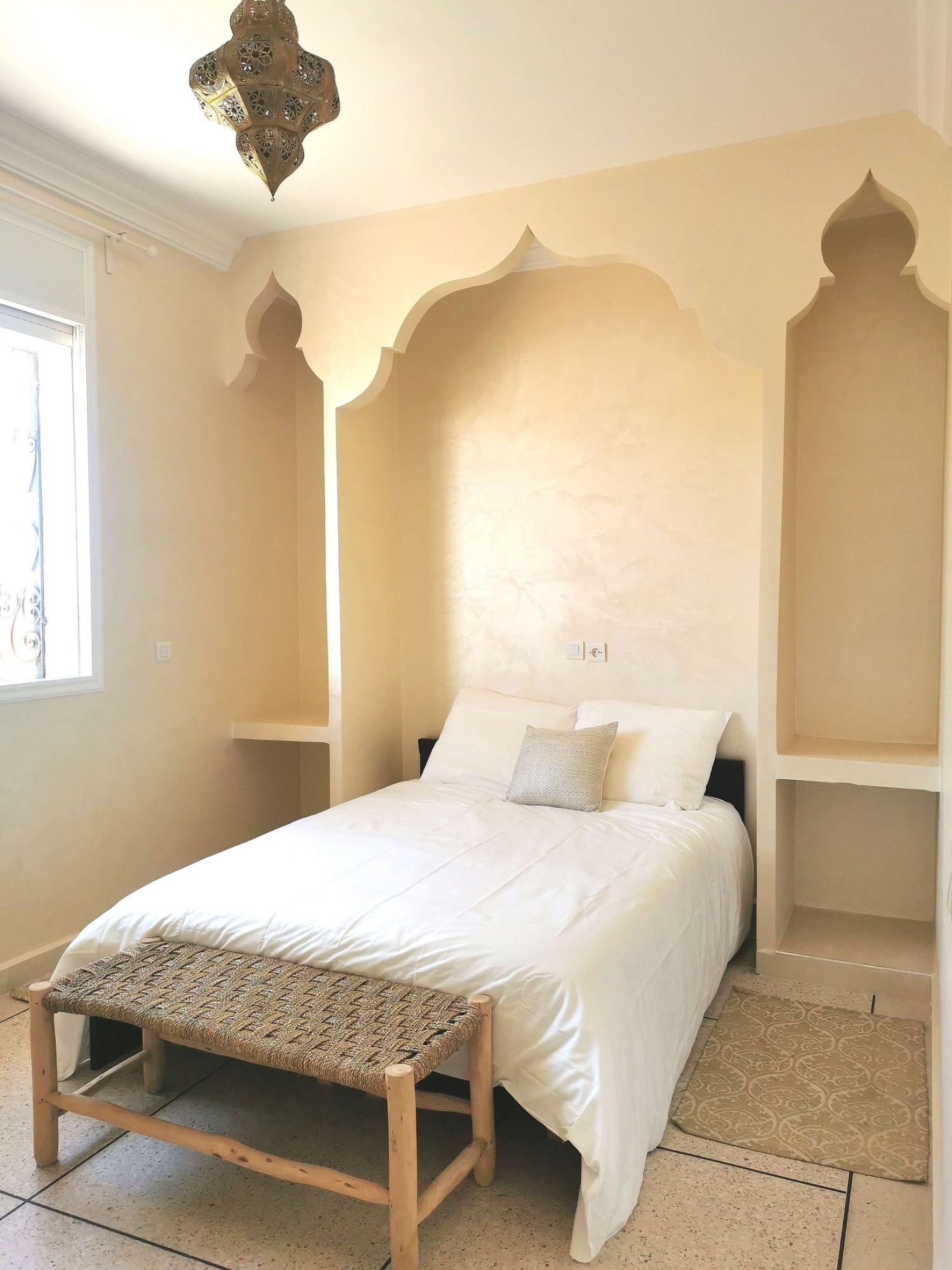 Bienvenue dans cette charmante maison de campagne avec piscine chauffée, nichée dans le douar d'Oulad Noumer. Villa de plain-pied spacieuse alliant confort moderne et charme marocain authentique — tadelakt, arches moucharabiées, lanternes en laiton — idéale pour 6 à 8 personnes.